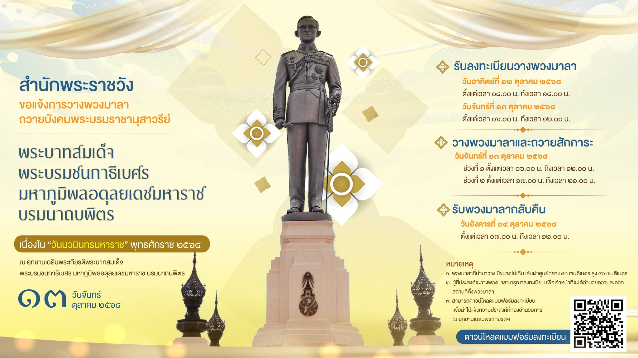 สำนักพระราชวัง ขอแจ้งการวางพวงมาลาถวายบังคมพระบรมราชานุสาวรีย์ พระบาทสมเด็จพระบรมชนกาธิเบศร มหาภูมิพลอดุลยเดชมหาราช บรมนาถบพิตร เนื่องใน “วันนวมินทรมหาราช” พุทธศักราช ๒๕๖๘