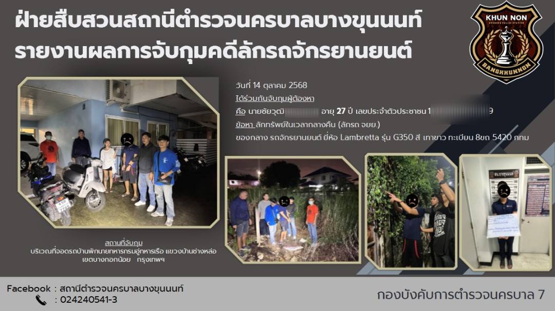 ไม่ทันข้ามคืน ตำรวจตามรวบ คนร้ายลักรถจักรยานยนต์ได้ เมื่อวันที่ 14 ต.ค.2568 เวลา 04.50 น.เจ้าหน้าที่สายตรวจได้รับเเจ้งเหตุรถจักรยานยนต์หาย จึงได้ไปตรวจสอบที่เกิดเหตุ เบื้องต้นผู้เเจ้ง เเจ้งว่าได้จอดรถมอเตอร์ไซค์ ยี่ห้อ lambretta รุ่นg350 สีขาว ป้ายทะเบียน 8 ขถ 5420 กทม. ไว้หน้าบ้าน(เลขที่455/97) ซอยจรัญสนิทวงศ์ 35 แขวงบางขุนศรี เขตบางกอกน้อย กรุงเทพฯ ตั้งเเต่เวลาประมาณ 16.00 ของวันที่ 13 ต.ค.68 ต่อมาผู้เเจ้งได้ออกมาทำธุระเวลา 04.50 ของวันที่14 ต.ค.68 ได้พบว่ารถมอไซค์คันดังกล่าวได้หายไปผู้เเจ้งจึงโทรเเจ้งเจ้าหน้าที่ตำรวจ สน.บางขุนนนท์ ตรวจสอบที่เกิดเหตุพร้อมนำผู้เสียหายแจ้งความที่ สน.บางขุนนนท์ ต่อมา พ.ต.อ.อุเทน ตั้งพิทักษ์เสมอ ผกก.สน.บางขุนนนท์ ได้สั่งการให้ฝ่ายสืบสวน สน.บางขุนนนท์ ติดตามสืบสวน จนสามารถร่วมกันจับกุมตัวผู้ต้องหาได้ คือ นายชัยวุฒิ ฯ พร้อมด้วยของกลาง รถจักรยานยนต์ ยี่ห้อ Lambretta รุ่น G 350 สีเทาขาว ทะเบียน 8 ขถ 5420 กทม.